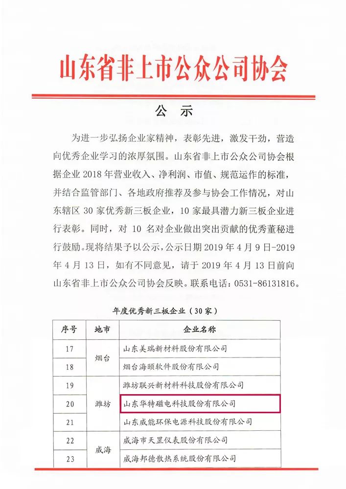 本次会议根据企业2018年度营业收入、净利润、市值、规范运作的标准,并结合监管部门、各地政府推荐及参与协会工作情况,对山东辖区30家优秀新三板企业,10家最具潜力新三板企业进行了表彰。华特公司在全省五百多家新三板企业中脱颖而出,荣莶/span>?018年度优秀新三板公号/span>“/span>称号、/span>