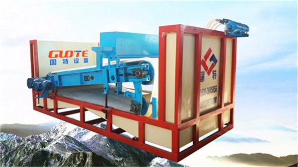 该产品矿浆在重力作用下沿磁板的倾斜方向向下流动,矿浆中的铁磁物在磁板强大的磁场力作用下被牢牢吸附在卸铁皮带上,卸铁皮带在电机带动下沿磁板倾斜的上方转动,同时将吸附的铁磁性物带入卸铁区、/p>