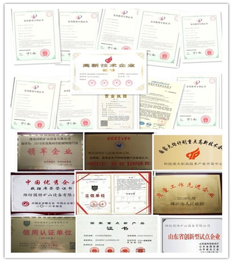 潍坊国特矿山设备有限公司位于山东省潍坊市青州市经济开发区,是山东省高新技术企业,公司先后通过ISO9001质量体系认证、环境体系认证、安全管理体系认证、欧盟ce认证、拥有国家专利十几项。先后被评为纳税先进企业,青州机械领军企业、/p>