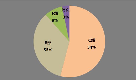 ?018年公开的硅微粉专利进行分析,硅微粉专利主要集中在C部(化学和冶金)和B部(作业、运输),两者分布占比为54%?5%。F部(机械工程、照明、加热)、G部(物理)、A部(农业)仅有少量分布、/p>