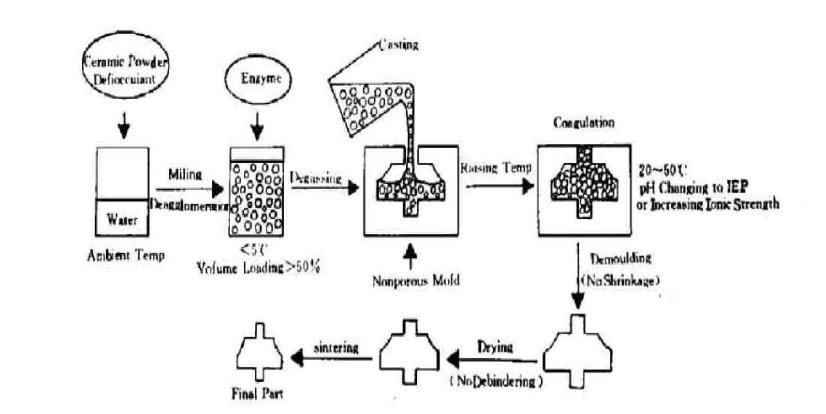 将生物酶技术、胶态化学及陶瓷工艺学融为一体,通过改变料浆pH值,或者增加料浆体系中离子强度从而降低粉体表面电荷来成型、/p>