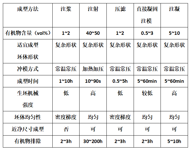 与注射成型相比,注凝成型方法有机物含量少,无脱脂排塑的困难;