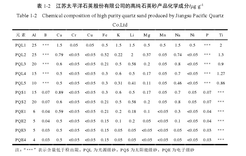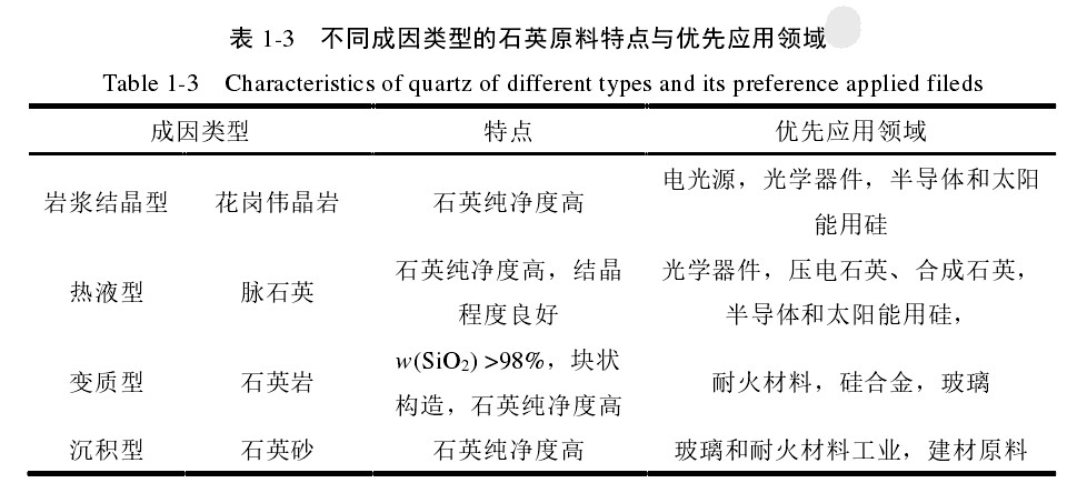 “高纯石英原料”与“玻璃硅质原料”都是被赋予经济意义的以石英矿物为主的工业矿物原料名称,但二者的矿物加工产品瞄准的应用领域差异明显,玻璃硅质原料主要用以生产平板玻璃和器皿玻璃,而高纯石英原料是用于制造光纤、石英坩埚、石英玻璃、单晶硅和多晶硅等高新技术产品的一类特殊石英资源。高纯石英原料更符合现代高新产业对原料极高化学纯度的特征要求、/p>