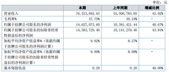 2019半年报显示公司营业收入保持平稳增长态势,实现营业收?,652.37万元,较去年同期增长43.02%,净利润1,462.71万元,较去年同期增长?0.67%,本报告期末,总资产为17,946.48万元,较本年年初上升?3.80%,净资产?5,469.36万元,较本年年初上升?0.44%、/p>