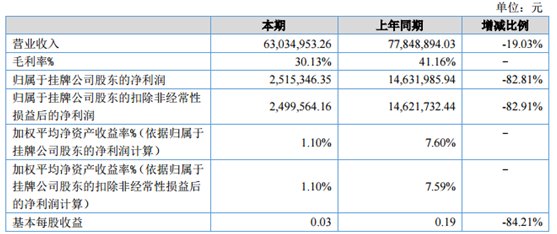 2019年半年度报告显示,报告期内实现营?1.78亿元,同比下?.28%;归属于上市公司股东的净利润2.51亿元,较上年同期下滑11.92%;基本每股收益为0.20元,上年同期?.22元、/p>