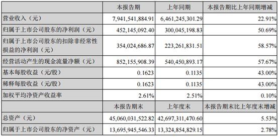 2019年半年度报告称,报告期内,实现营业收?41.11亿元,同比增?1.09%;实现归属于上市公司股东净利润20.09亿元,同比增?3.76%;综合毛利率26.22%,同比增?.6个百分点、/p>