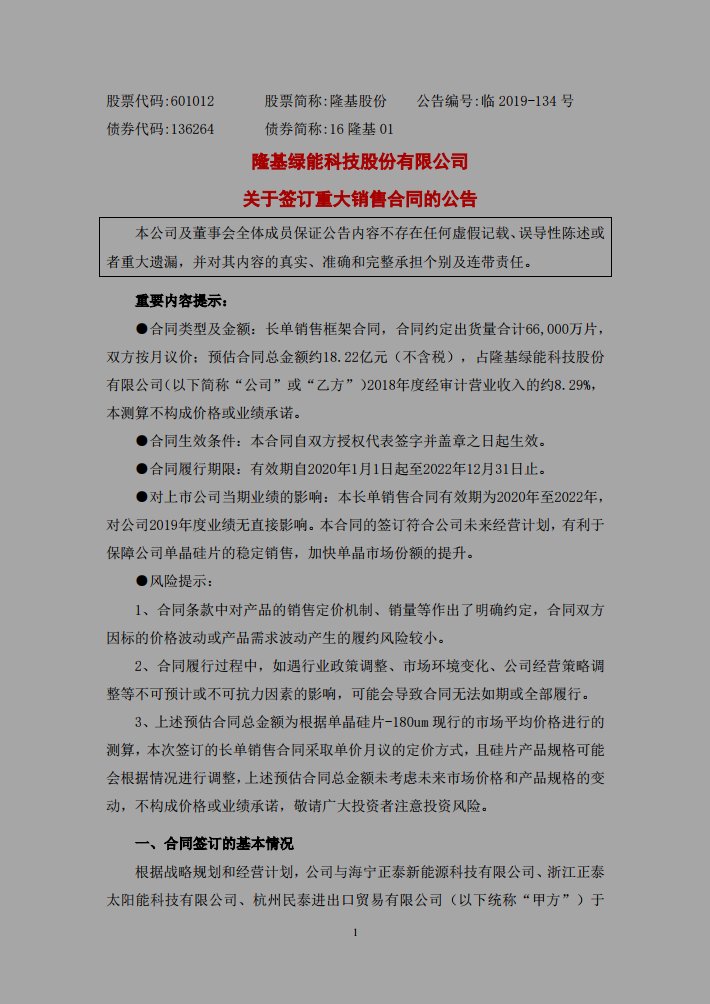 公告显示,隆基股份与海宁正泰新能源科技有限公司、浙江正泰太阳能科技有限公司、杭州民泰进出口贸易有限公司??日签订了长单销售框架合同,合同约定出货量合?6000万片单晶硅片,双方按月议价,预估合同总金额约18?2亿元(不含税),占隆基绿能科技股份 有限公司2018年度经审计营业收入的??9%。本次合同签约对方均为正泰电器控股子公司。合同有效期?020??日起?022?2?1日止、br/>