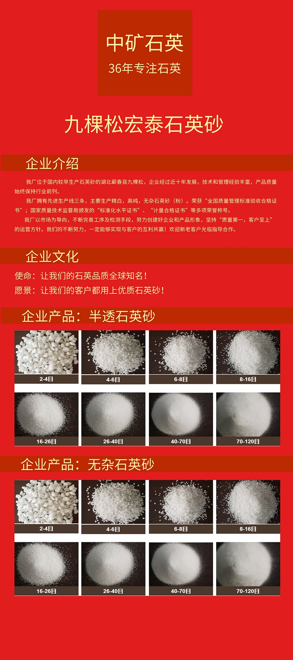 我厂位于国内较早生产石英砂的湖北蕲春县九棵松,企业经过近十年发展,技术和管理经验丰富,产品质量始终保持行业前列、/p>