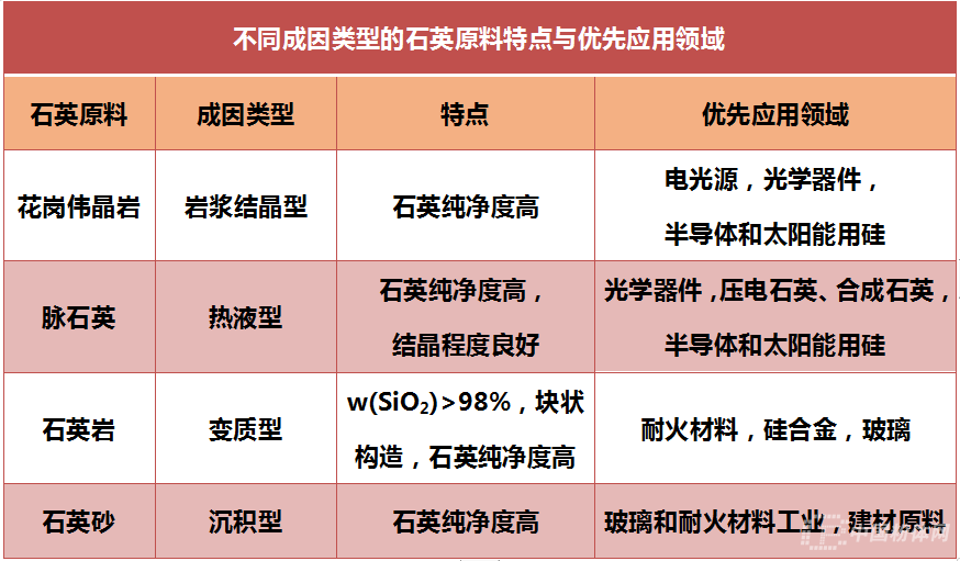 高纯石英原料资源类型并不局限于由石英单一组成的天然矿物岩石,它的来源既包括地质产出条件严苛的水晶,又包涵脉石英、石英岩、石英砂岩等,甚至可以从花岗伟晶岩等富石英矿物的岩石中获取。不同成因类型的石英原料性质存在差异,应用领域也有所不同、/p>