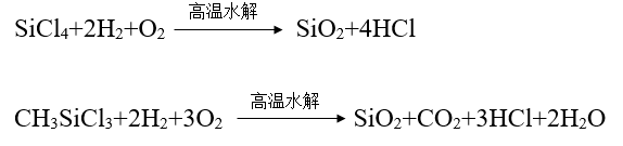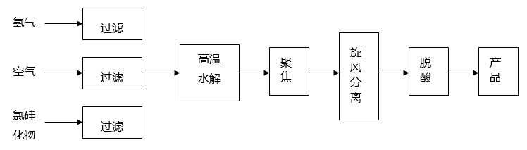 该工艺的主要原料包括四氯化硅和甲基三氯硅烷。利用硅烷与氢气氧气混合后,高温条件下发生水解生成无定型的SiO2,温度需要达?200~1600℃,然后通过骤然降温、旋风分离等气固分离得到产品。反应原理用反应式表示为9/p>