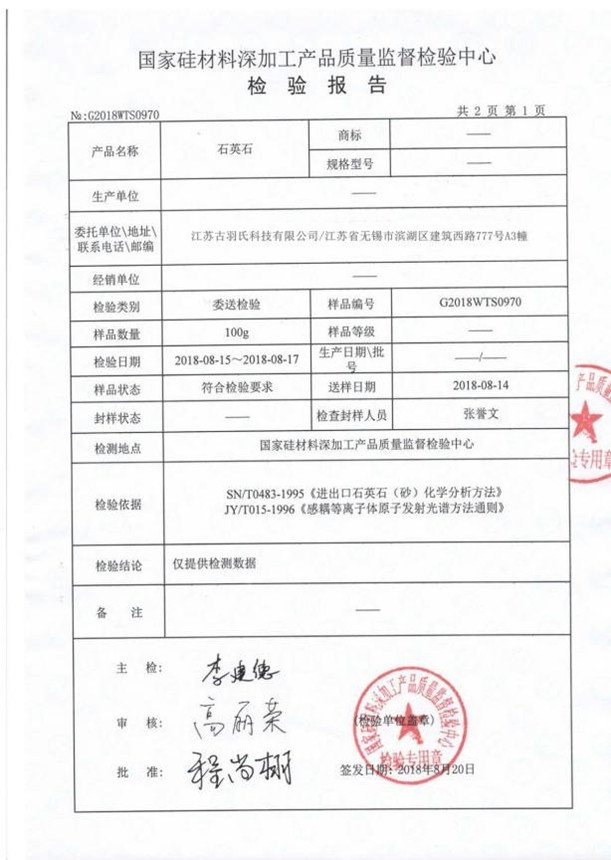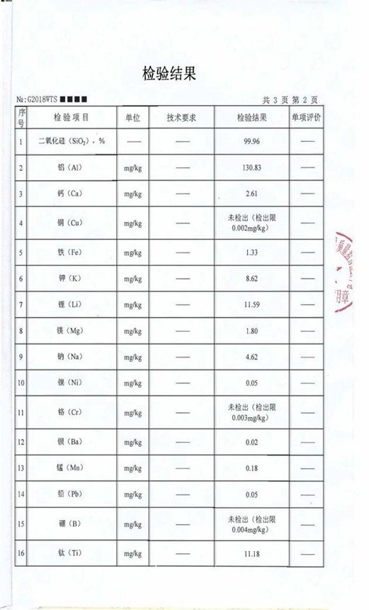 将样品送样给权威检测部门进行检测,总体来看,整个矿的石英矿石硅含量?9.96%以上,其中铁、钴、镍等过渡族元素,钾、钠、锂等碱金属元素和硼元素含量较低,达到了较高的品位、/p>