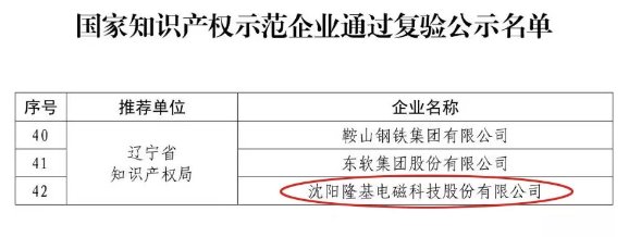 中国粉体网讯近日,国家知识产权局公布了?019年度国家知识产权优势示范企业评审和复验结果公示》,沈阳隆基电磁科技股份有限公司与鞍山钢铁集团有限公司、东软集团股份有限公司作为辽宁企业,共同通过复验、/span>