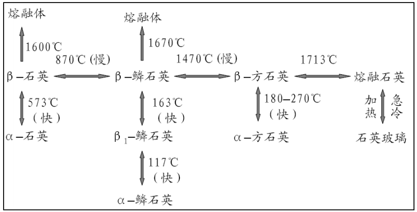 石英有多种同质变体,常压下有七种晶型:?石英、?石英、?鳞石英、?-鳞石英、?鳞石英、?方石英和β-方石英,它们之间的常压转变温度如图所示。其中?型表示高温下稳定存在的晶型,α-型表示低温下稳定存在的晶型、/p>