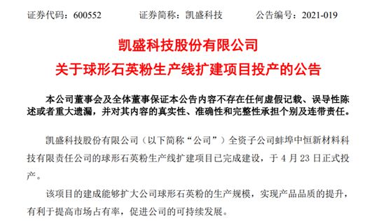 中国粉体网讯2021??3日,据凯盛科技公告,全资子公司蚌埠中恒新材料科技有限责任公司的球形石英粉生产线扩建项目已经完成建设,??3日正式投产。据悉,该项目的建成能够扩大公司球形石英粉的生产规模,实现产品品质的提升,有利于提高市场占有率,促进公司的可持续发展、/span>