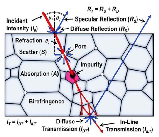 ▲多晶体陶瓷光散射来源示意图(来源:韩丹.镁铝尖晶石透明陶瓷的制备与性能研究(/span>