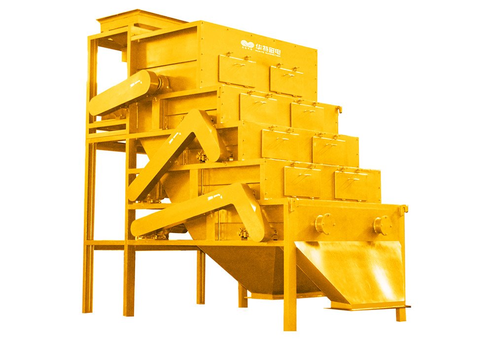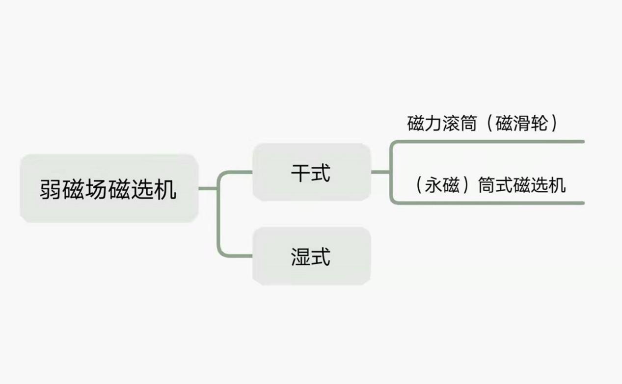 弱磁场磁选机主要用于强磁性物的磁选,具体磁化系数大于38×10,/span>6m/kg,如磁铁矿、磁赤铁矿、钛磁铁矿、磁黄铁矿和锌铁尖晶石等亚铁磁性矿物。弱磁场磁选机主要分为干式弱磁场磁选机以及湿式弱磁场磁选机。干式弱磁场磁选机又可以分为磁力滚筒以及永磁筒式磁选机、/span>