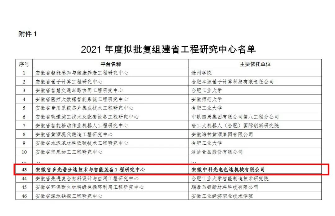 中国粉体网讯近日,安徽省发展和改革委员会公布?021年安徽省工程研究中心评审认定名单,中科光电“安徽省多光谱分选技术与智能装备工程研究中心”获得批复、/p>