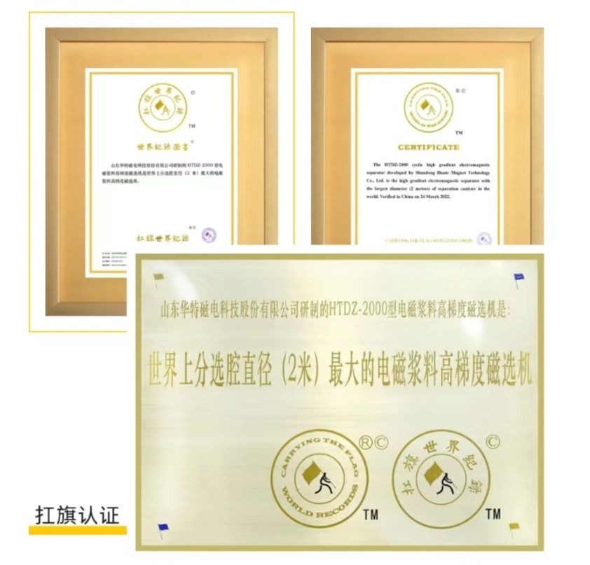经扛旗世界纪录机构(CARRYING THE FLAG WORLD RECORDS LIMITED)官方认 “山东华特磁电科技股份有限公司自主研制的HTDZ-2000型电磁浆料高梯度磁选机是世界上分选腔直径?米)最大的磁选设备”、/p>