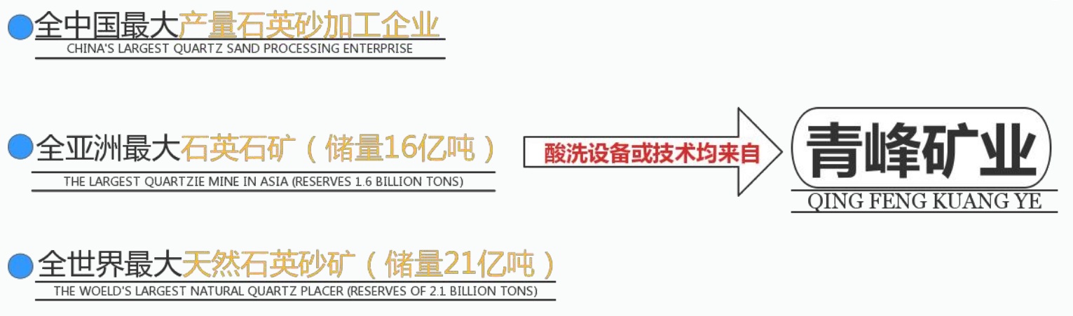 江西省青峰矿业有限公司是国内首家专业从事石英石原矿、石英砂环保酸洗设备制造与石英砂酸洗提纯技术研发的科技型公司。由我公司自主研发的国家专利产品“非?属矿石除铁酸洗设备”为国内外众多石英加工企业解决了石英砂除铁增白难的问题,并授予为“中国绿色环保设备”“全国节能绿色环保推广产品”,得到了中科院、中国非金属研究院等有关部门领导的高度重视。我公司共获得“新型电加热在酸洗中的应用”等20余项国家专利、/p>