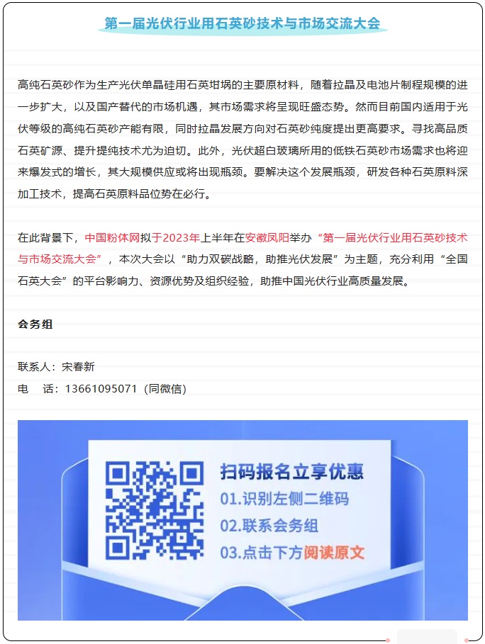 中国粉体网将?023??1日在安徽凤阳举办“第一届光伏行业用石英砂技术与市场交流大会”,赣州金环磁选科技装备股份邀您一起参加、/span>