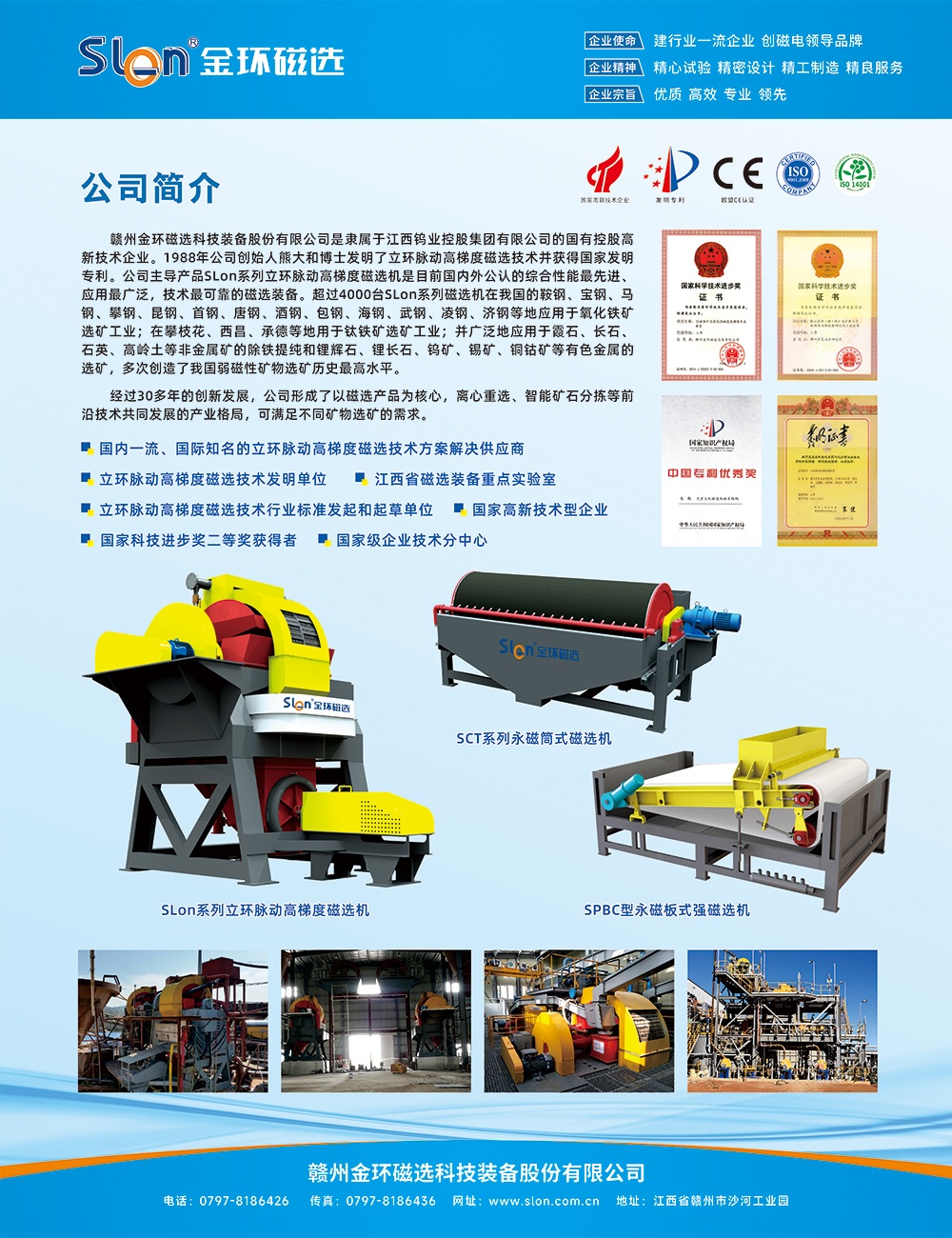 公司专业从事磁选装备的研发与生产,并提供矿物选别试验与流程设计、非金属矿除铁提纯试验与流程设计、矿山EP总包服务等,现主要生产电磁、永磁等三大系列29种型号近200个规格产品。SLon磁选设备已广泛应用于弱磁性铁矿、钛矿、锰矿、黑钨矿、稀土、钽铌、赤泥等矿物的分选和长石、石英砂?/span>高岭圞span microsoft="" font-size:="">等非金属矿物的除铁提纯。SLon磁选设备除在国内金属矿和非金属矿领域广泛应用外,还批量出口到美国、印度、俄罗斯、伊朗、菲律宾、马来西亚、加拿大、澳大利亚、巴西、秘鲁、塞拉里昂、泰国、韩国等20多个国家和地区,市场保有量超4000台套,已成功为全球超?500家客户提供了优质的技术服务与产品解决方案 是业内首屈一指的磁选设备供应商?nbsp;