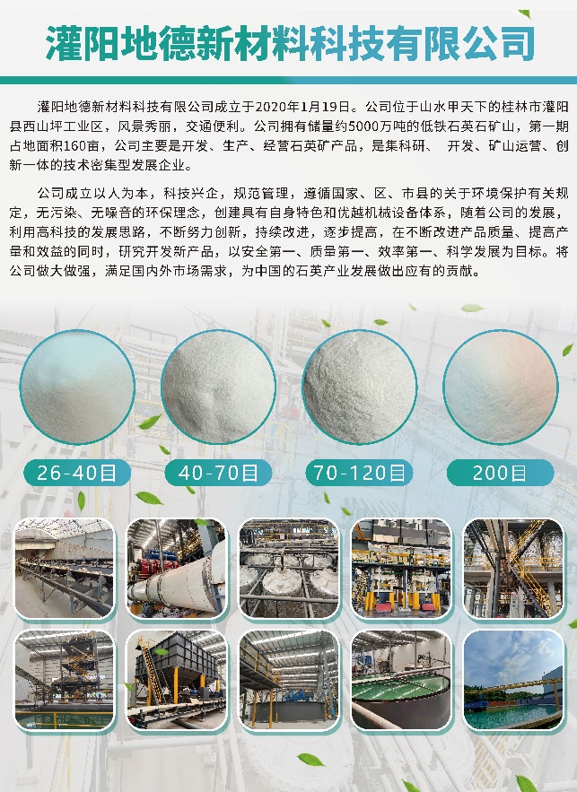 灌阳地德新材料科技有限公司办公室地址位于“山水甲天下”的桂林,广西壮族自治区桂林市灌阳县西山坪工业集中区?原灌阳县贵达有色金属有限公司),于2020?1?9日在灌阳县工商行政管理局注册成立,在公司发展壮大?年里,我们始终为客户提供好的产品和技术支持、健全的售后服务,我公司主要经营新材料研叐石英矿山开釆石英矿加?石英矿沙销?建筑材料(不含河沙)生产与销售、/span>