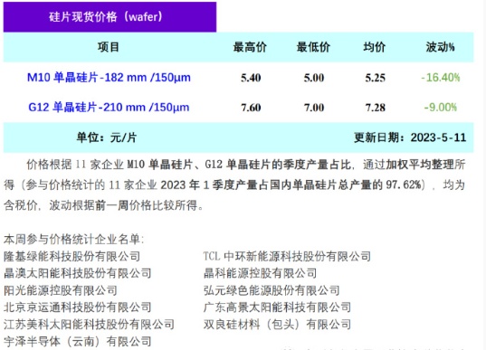 据粉体网了解,中国有色金属工业协会硅业分会最新发文称,本周硅片价格大幅下跌。M10单晶硅片?82 mm /150μm)价格区间在5.0-5.4?片,成交均价降至5.25?片,周环比降幅为16.4%;G12单晶硅片?10 mm/150μm)价格区间在7.0-7.6?片,成交均价降至7.28?片,周环比降幅为9%。本周市场成交价格混乱,成交量普遍偏小。价格大幅下跌主要由于两方面原因,其一是本周价格降幅横跨两周,因此跌幅略显夸张,但实则经历了两轮阶段性调价;其二是传导原材料降价空间,并持续向下游释放利润、/p>