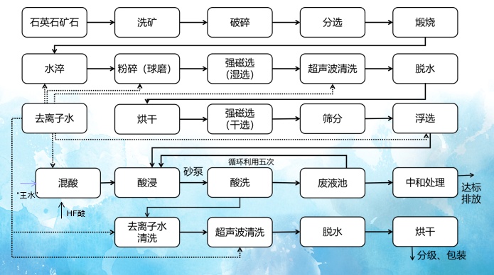 目前石英砂除杂的方法主要分为物理方法、化学方法。物理方法有磁选、反向浮选及煅烧水淬处理。化学方法包括无机酸浸及有机酸浸。常用的无机酸通常是HF、HNO3、HCl和H2SO4。目前通常通过物理方法与化学方法相结合能实现更好的除杂效果、/p>
