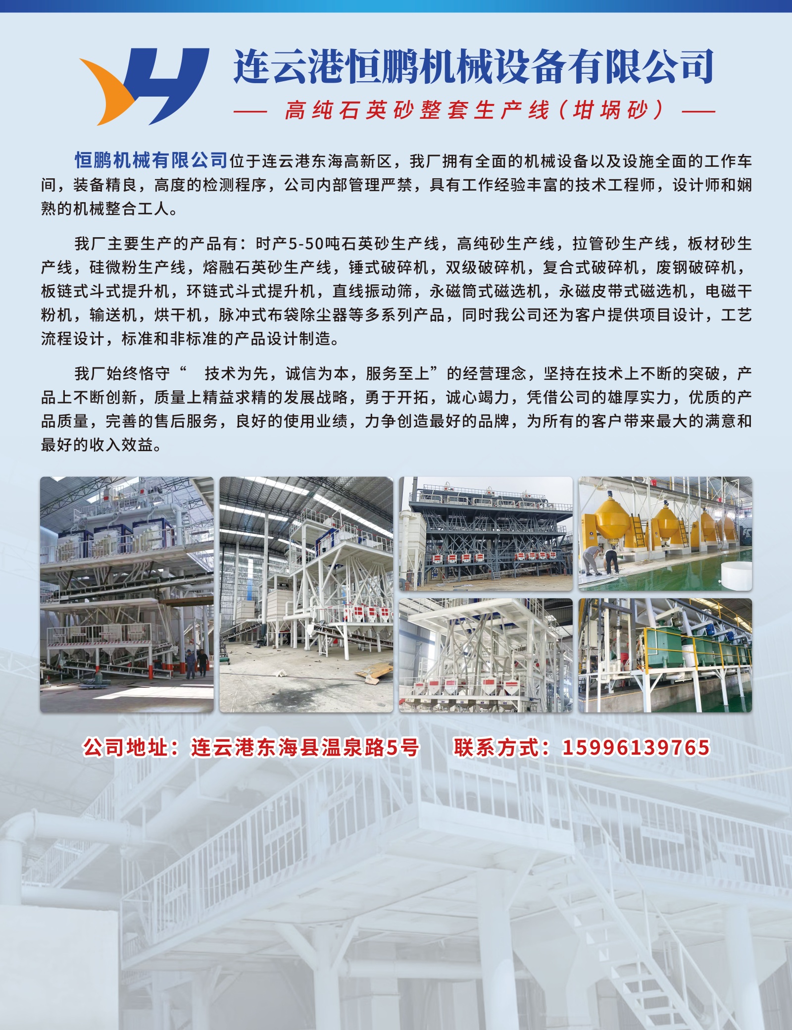 连云港恒鹏机械设备有限公司坚持高性价比、高合格率、高使用寿命产品路线,专业提供石英板材砂产线?-120目),石英玻璃砂产线?0-160目),石英高纯砂产线?0-200目),破碎、制砂、烘干、筛分、磁选、提升、除尘等设备及刀具等耗材配件、/span>