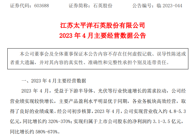 公告显示?023?月,受益于下游半导体、光伏等行业快速增长的需求拉动,石英股份经营业绩实现较快增长,主要产品盈利水平明显优于同期,各业务板块高效经营,取得了良好的业绩成果。经石英股份初步核算?023?月,公司实现营业收入?.8-5.3亿元,同比增长约320%-370%;实现归属于上市公司股东的净利润?.1-3.5亿元,同比增长约580%-670%、/p>