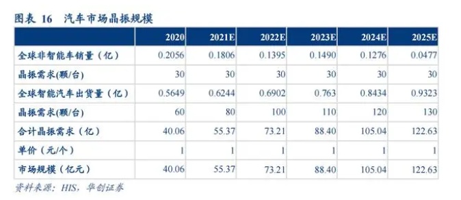 上海证券研报指出,智能电动车渗透加速,车规晶振需求量也将迎来全面增长。相较传统汽车,新能源电动汽车对于车规晶振的需求大幅度上升。普通经济型汽车配置30-40颗晶振,豪华型汽车配?0-110颗晶振,而每台新能源汽车配置晶振多达100-150颗、br/>