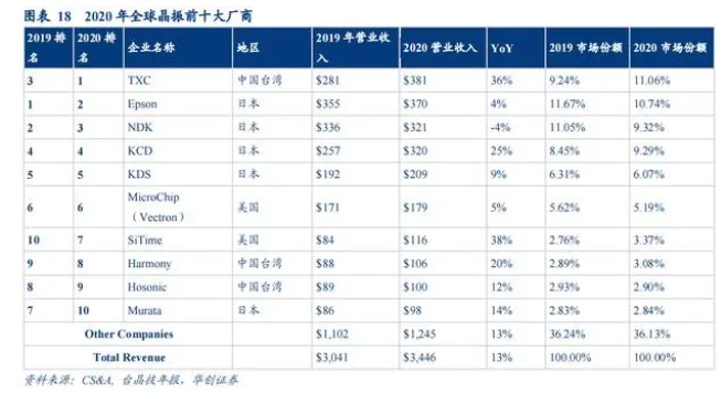 市场格局方面,日本晶振厂商占据了全球晶振市场的主要份额,除了台晶技(TXC)以外,全球?名中?家来自日本,但日本厂商市场份额逐渐被台湾厂商抢占。大陆厂商中,按?020年统计,泰晶科技作为大陆第一大晶振厂商,市占率近3%,本土替代空间广阔、br/>