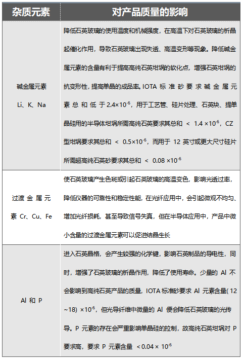 杂质元素对高纯石英产品的质量影响很大,碱金属、过渡金属、Al及P等元素含量是高纯石英原料的关键指标。杂质元素的含量要求根据制备的石英玻璃用途不同而不同,但总的趋势是越低越好、/p>