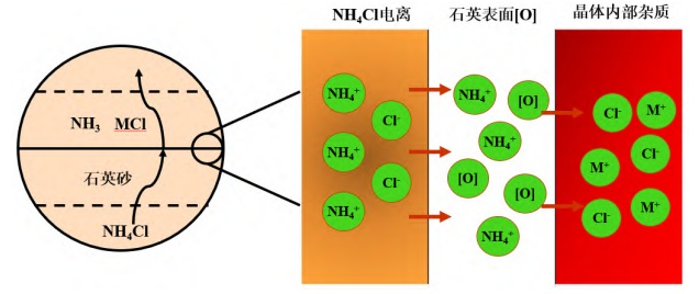 氯化焙烧是去除石英晶格杂质、碱金属等间隙原子类杂质最主要的方法,氯化焙烧是在一定温度和氛围条件下,将杂质组分离子转化为低沸点的氯化物,进而将杂质组分分离的过程。常用的氯化剂有氯气、氯化氢、氯化铵、氯化钠和氯化钙等,氯化焙烧按产物形态可分为高温焙烧(氯化挥发?、中温焙?氯化焙烧—浸出法)、氯化—离析、/p>