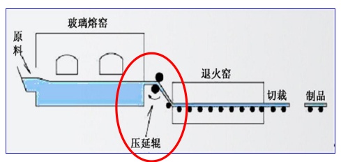 1、玻璃在两个压延辊的挤压作用下挤出成垊/p>