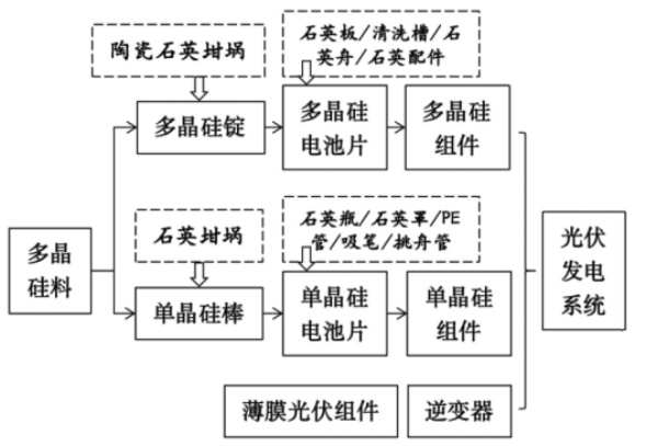 在光伏制造过程中,石英坩埚等石英制品是用于光伏单晶硅、多晶硅生产的重要耗材,例如石英坩埚在硅棒、硅锭生产中用于盛装熔融硅;石英舟、管、瓶、清洗槽等在电池片生产过程中的扩散、清洗等工艺环节中起到承载功能等。石英坩埚的性能直接影响着拉晶质量,石英坩埚中杂质元素含量过高时,石英坩埚在高温状态下容易析晶;Al含量过高,会影响拉制单晶硅的纯度;K、Na、Li等碱金属元素含量超标,将导致石英坩埚的软化点大幅下降,造成坩埚坍塌,使拉晶无法进行、/p>