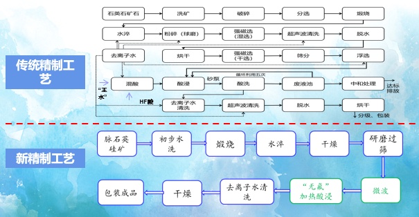 目前,国内高纯石英砂精制工艺基本大多停留在传统模式。传统精制工艺主要采用物?煅烧、微波等)与化?酸浸)联合的方法除杂,传统高纯石英砂精制工艺流程中需要经过多次酸浸,普遍存在HF等强酸污染环境问题,另外,传统精制工艺的能耗高,工艺流程中易出现气液包裹体含量不稳定等问题,严重制约着国产高纯石英砂的应用与发展、/p>