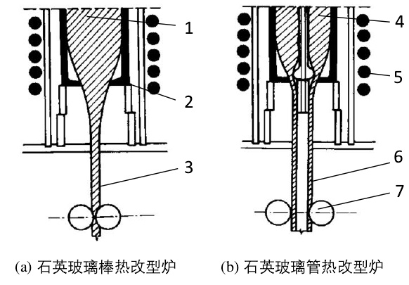 (图中部件:1-石英玻璃母棒?-发热体;3-石英玻璃棒;4-石英玻璃母管?-感应线圈?-石英玻璃管;7-牵引器)