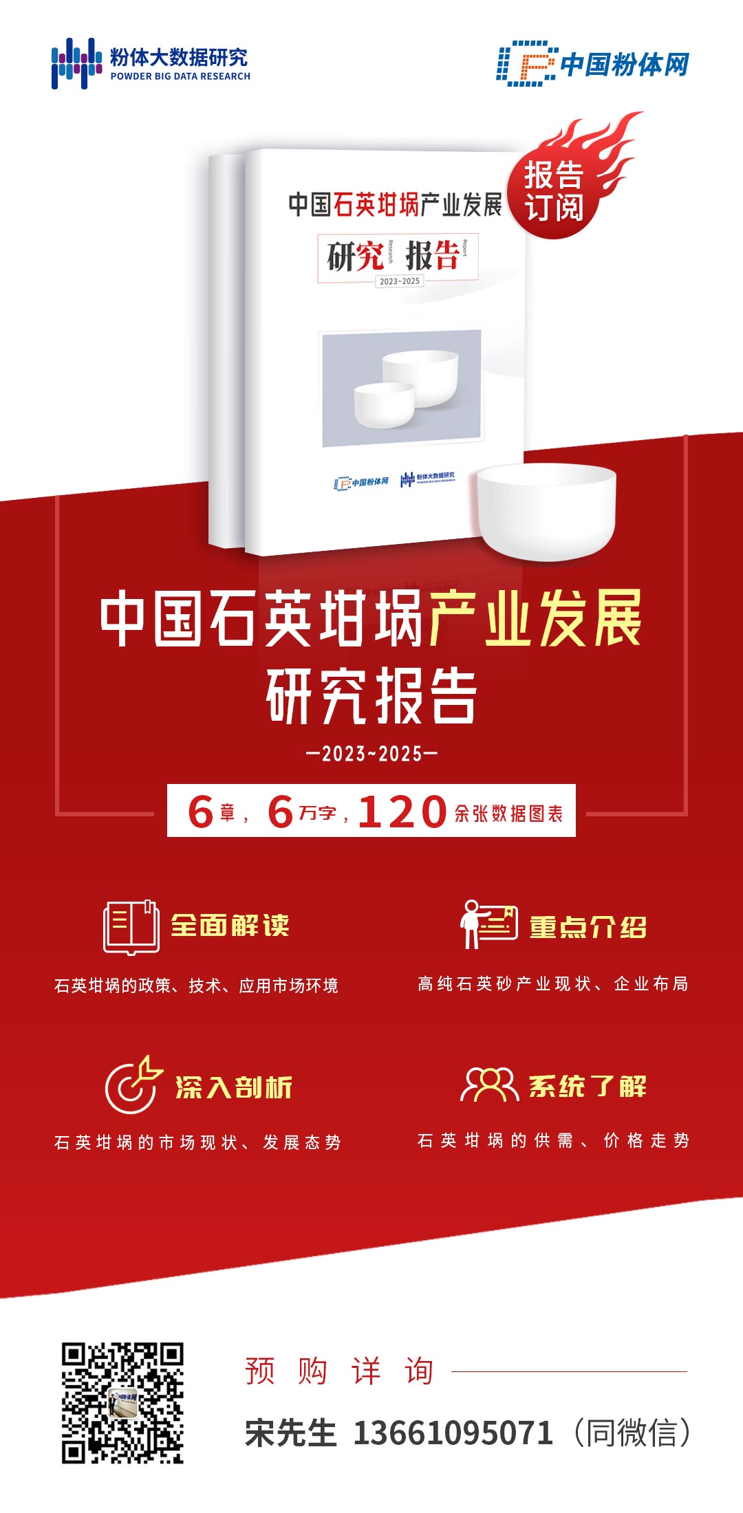 为帮助产业链相关企业系统了解中国石英坩埚行业发展现状,把握产业未来发展趋势,中国粉体网粉体大数据研究推出《中国石英坩埚产业发展研究报?2023?025)》。报告客观剖析了石英坩埚行业当前的政策、经济、技术环境;分析了高纯石英砂、石英坩埚重点企业的经营现状及发展竞争格局;并对石英坩埚的市场现状、发展趋势进行了客观的研判、/p>