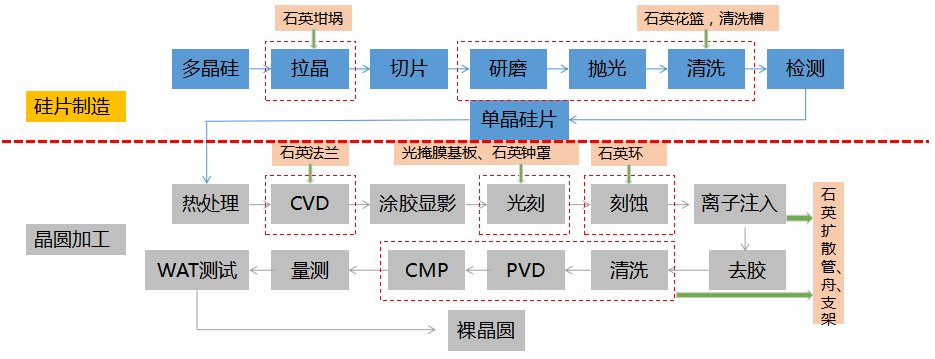 另一方面,不同应用细分领域对于石英玻璃特性需求有所差异。如半导体领域,在高温区使用的石英玻璃制品要求低羟基含量,通常使用电熔方法制备;低温区材料则更多考虑气熔石英玻璃;而在掩膜基板生产中则更多使用杂质含量低、透光率高的合成法制备的石英玻璃、/p>