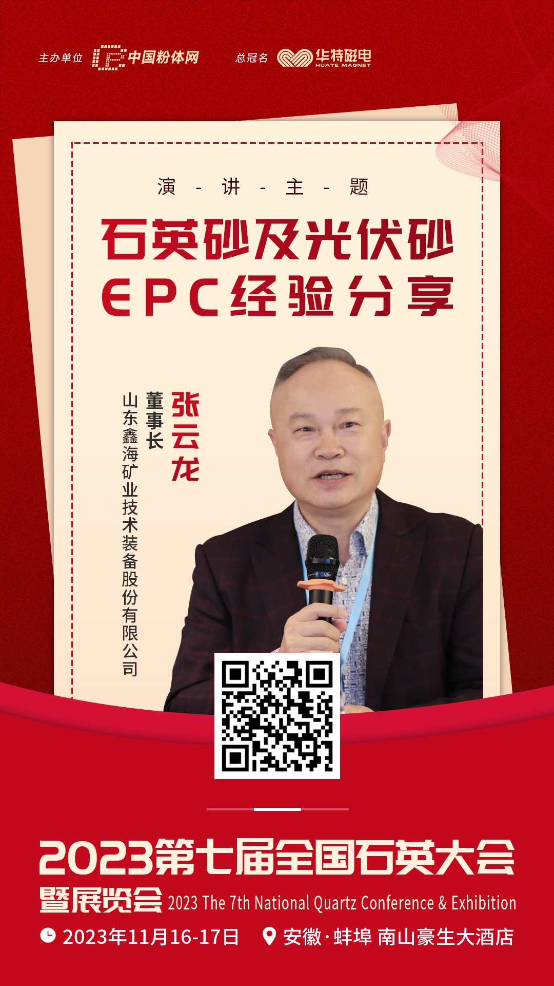 2023?1?6-17日,由中国粉体网主办皃strong>?023(第七届)全国石英大会暨展览会“/strong>将在安徽蚌埠召开,山东鑫海矿业技术装备股份有限公司的张云龙董事长将做《石英砂及光伏砂EPC经验分享》的报告,届时,张董将结合实际案例分享石英砂EPC经验、/p>