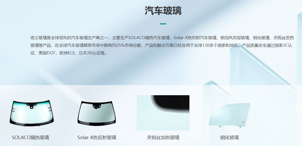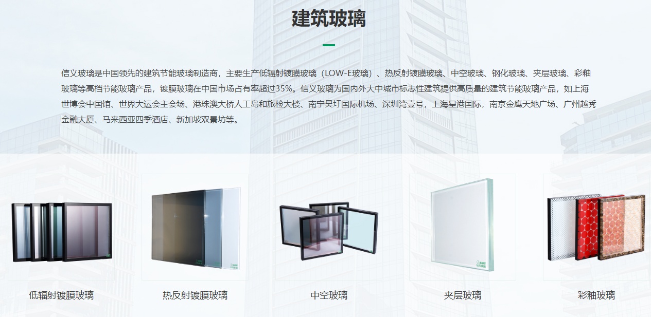 信义玻璃控股有限公司创建?988年,总部位于中国香港,于2005?月在香港联交所主板上市(股票代码:00868.HK),是全球领先的综合玻璃制造商,致力于生产优质浮法玻璃、汽车玻璃、节能建筑玻璃等产品,销售网络遍布全?40多个国家和地区、/span>