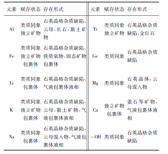 矿物包裹体中存在氯化物、硅酸盐、碳酸盐、硫酸盐等物质,Li、Na、K、Ca、Cr、Al、Fe是主要的杂质元素、/p>