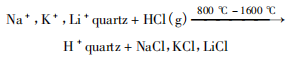 氯化焙烧是在低于石英熔点温度下,石英中的杂质组分与氯化剂作用转变为氯化物而挥发出来,石英在高温氯化焙烧过程中存在晶型转变,使得石英晶格中的金属离子可能会迁移扩散到石英表面,与HCl、NH4Cl和Cl2等发生化学反应变成易挥发组分而实现与石英的分离,同时也阻止了杂质元素在冷却过程再迁移扩散至石英晶格中。石英晶格中碱金属杂质在HCl气氛中焙烧时会发生如下化学反应: