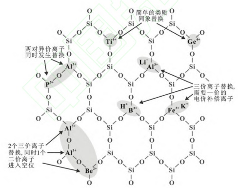 ?电荷补偿替代:如Al3+、Fe3+替代Si4+形成了[AlO4/M+?或[FeO4/M+?结构中心,M+充当电价补偿离子平衡电荷。一般为碱金属离子,有时也可以为?价离?Be2+、B2+、Rb2+、Sr2+、Ba2+)、/p>