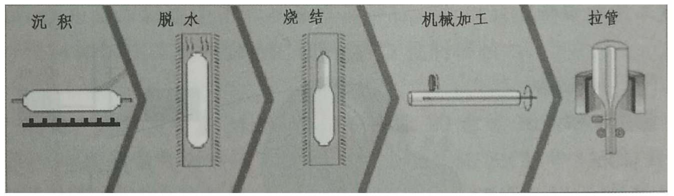 高纯石英衬套管的制备技术主要有:气炼电熔二步法工艺、外部气相沉积(OVD)、高频等离子固相外沉积(PSOD)(或配套中频无接触二步法拉管工艺)、连续熔制工艺、溶?凝胶(Sol-Gel)工艺等。其中,气炼电熔二步法因产品能耗大、成本高,且气炼熔制的石英衬套管羟基含量较高,后期已逐渐淘汰;连熔直接拉管工艺使所制备的衬套管中的缺陷、杂质、羟基很难控制,进而影响光纤的衰减和强度,而且所制备的套管很少被用于单模光纤领域;Sol-Gel制备套管工艺在干燥和烧结环节成品率低,到目前为止尚未实现大规模应用。因而在光纤预制棒用石英衬套管制造方面,其主流技术是国外的OVD工艺和国内的PSOD工艺、/p>