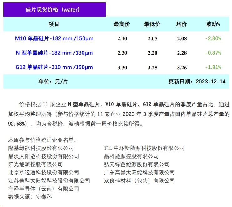 中国粉体网讯据中国有色金属工业协会硅业分?2?4日消息,本周硅片市场价格维持跌势。M10单晶硅片?82 mm /150μm)成交均价降?.08?片,周环比降?.8%;N型单晶硅片(182 mm /130μm)成交均价降?.28?片,周环比降?.87%;G12单晶硅片?10 mm/150μm)成交均价降?.26?片,周环比降?.81%,N型硅片价格相对P型有所支撑、/p>