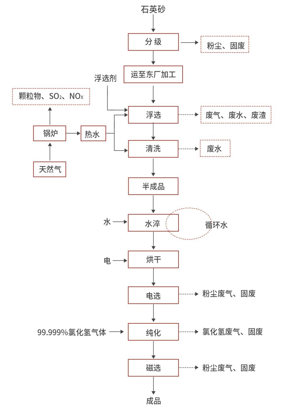 截至目前,陈总表示公司高纯石英砂日产已达30-40吨。同时一些项目也在陆续投建中。如2023?月,连云港神汇硅材料科技有限公司年产2万吨高纯石英砂项目环评公示。该项目总投?0000万元,建设地点为东海县洪庄镇镇区工业集中区。主要建设内容为:项目占地约37156平方米,厂房?1850平方米、附属设?463平方米,购置高温烤砂炉、烘干机、电选机、磁选机等设备。工艺流程:半成品石英砂-超高温水?烘干-电?纯化-磁?成品、/p>