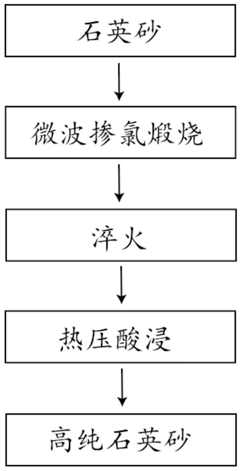 据悉,本发明公开了一种无氟无硝法制备高纯石英砂的工艺,属于高纯石英砂制备技术领域,包括如下步骤:S1石英砂掺杂氯盐进行微波煅烧,先以10?20?min的升温速率升温?00℃后,再??10?min的升温速率升温?00℃后保温1?3h;S2取出石英砂,淬火溶液淬火后用水冲洗;S3过滤干燥后的石英砂加入混酸溶液进行热压酸浸,搅拌条件下于80℃反?.5?2.5h后,??10?min的速率升温?00℃反?.5?1.5h,反应后固液分离对浸出渣进行超声清洗干燥、/p>