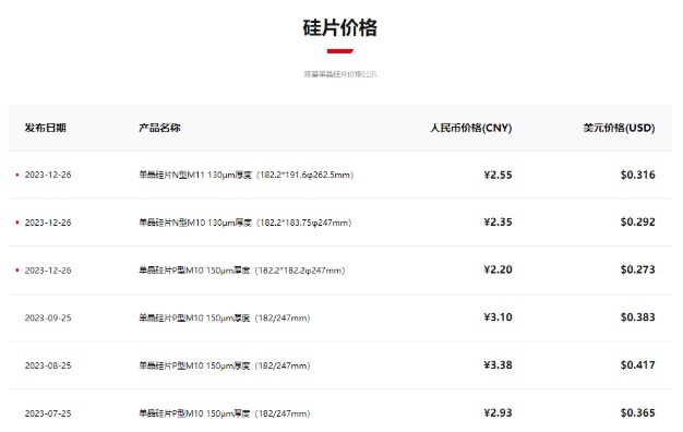 中国粉体网讯隆基官网12?6日晚间发?2月单晶硅片价格公示,“单晶硅片P型M10 150μm厚度”价格由3.10元人民币下调?.20元,与上一次报价即9月份相比降幅?9%、br/>